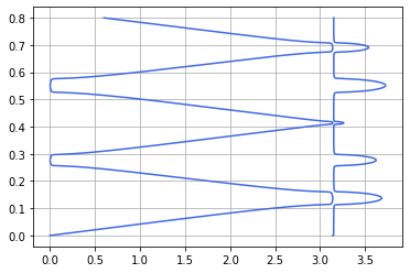 10.1007@s41683-020-00061-2plt.grid() plt.plot(aux.real,f/1e12,'royalblue',3.14+abs(aux.imag),f/1e12,'royalblue') plt.show()