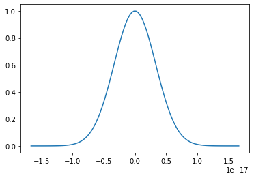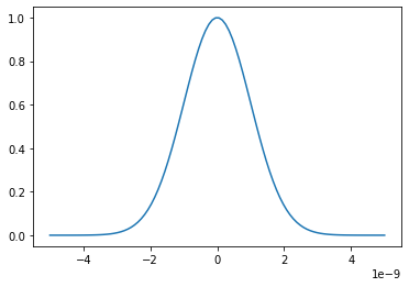 import numpy as np import matplotlib.pyplot as plt import math c=3e8 l0 = 1e-9 t0 = l0/c sigma = l0 z = np.linspace(-5*l0,5 *l0, 100) Ez=np.exp(-0.5*(z/sigma)*(z/sigma)) plt.plot(z,Ez)