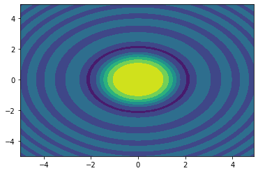import numpy as np import matplotlib.pyplot as plt c = 3e8 l0 = 1e-9 t0 = l0/c x = np.arange(-5, 5, 0.1) y = np.arange(-5, 5, 0.1) xx, yy = np.meshgrid(x, y, sparse=True) z = np.sin(xx**2 + yy**2) / (xx**2 + yy**2) h = plt.contourf(x,y,z) plt.show()